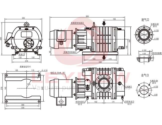 電機功率:2.20Kw 極限真空:0.001 mBar 額定電壓:200-240△/345-415Y 額定流量:600 m3/h