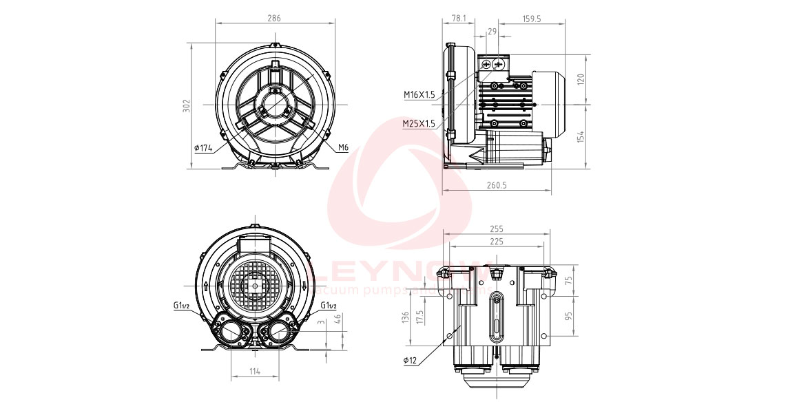 電機(jī)功率:1.5 Kw 極限真空:200 mBar 額定電壓:200-240V 額定流量:210 m3/h